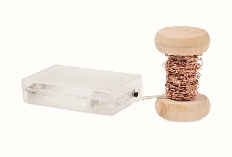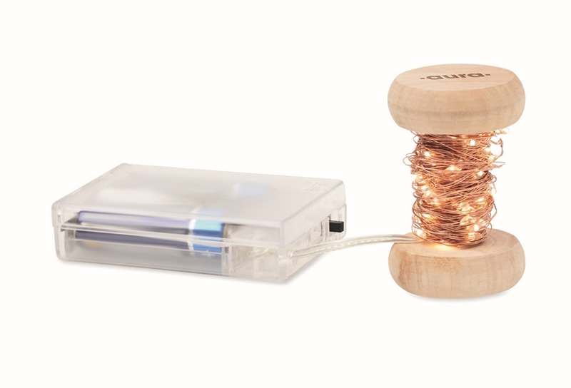 Řetěz s 50 LED pohádkovými světélky s teplým žlutým světlem, na dřevěné cívce. Délka: 5m. Tři baterie AA nejsou součástí balení.