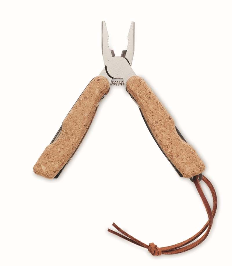 Multifunkční kapesní nářadí z nerezové oceli s korkovým potahem rukojeti a PU šňůrkou. Má 9 funkcí: kleště, 2 otvíráky, křížový šroubovák, pilku, nůž, pilník a plochý šroubovák. Korek je přírodní materiál, vzhledem ke své struktuře a povrchové pórovitosti může být výsledek tisku na stejných předmětech rozdílný.