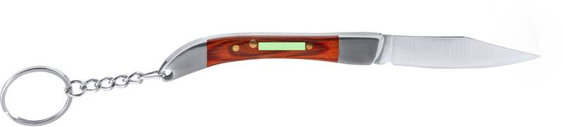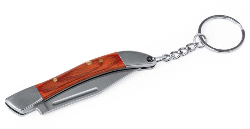 Praktická klíčenka na nůž s čepelí z nerezové oceli a odolnou kovovou rukojetí s detaily z přírodního dřeva. Dodáváno v samostatné kraftové designové krabičce.