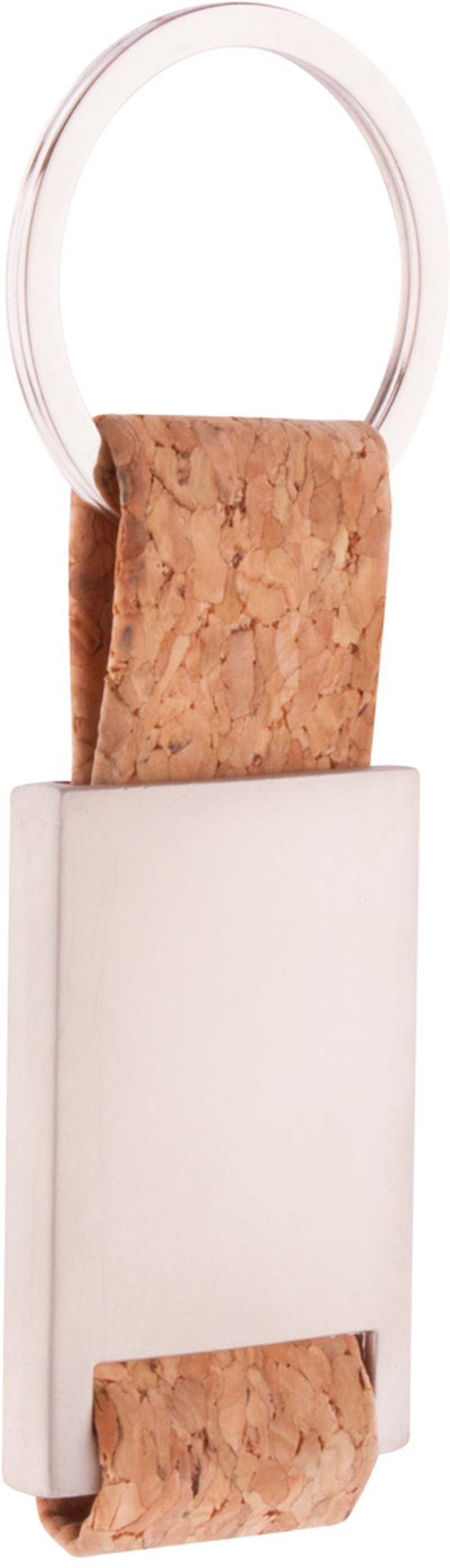 Obdélníkový kovový přívěsek na klíče s řemínkem z přírodního korku a kovovým kroužkem. detailCena bez DPH
