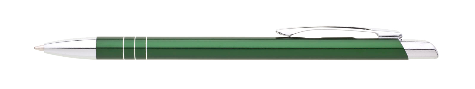 Tenká kovová propiska SOTTI ve světlezelené barvě s chromovými doplňky a třemi tenkými proužky. Náplň X-20, modře píšící.