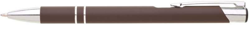 Hliníková propiska se stříbrnými doplňky a měkkým pogumovaným soft povrchem v hnědé barvě.
