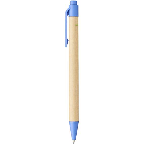 Berk kuličkové pero z recyklované lepenky a kukuřičného plastu. Ekologické kuličkové pero se stiskacím mechanismem, tělem vyrobeným z biologicky odbouratelného papírového materiálu a s doplňky z kukuřičného plastu, dostupné v různých barvách. Barva recyklované lepenky se může různit. Recyklovaná lepenka, kukuřičný plast.