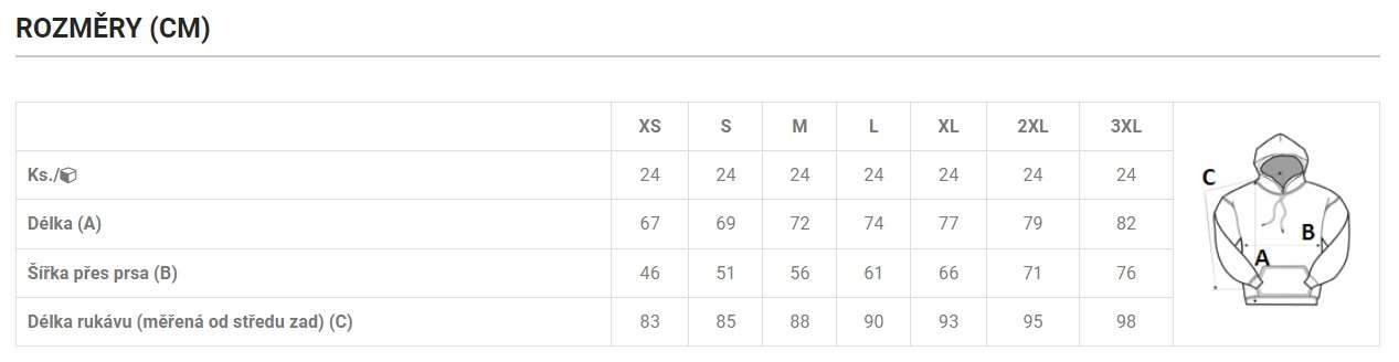 80% česaná ring-spun bavlna, 20% PES, nepodšívkovaná 3dílná kapuce, překřížený otvor kapuce s žebrovaným lemem na okraji, dvojité jehlové šití na rameni, průramku, krku, pasu a manžetách, 1 x 1 žebro se spandexem, velikost XS-3XL