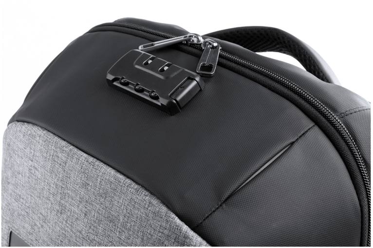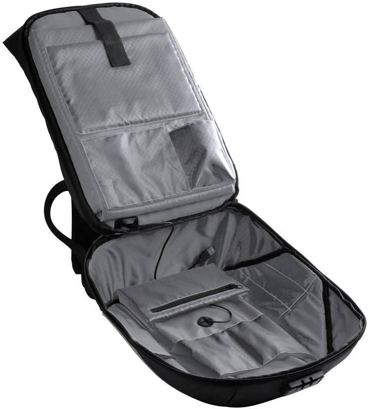 Batoh se solárním panelem, připojením USB, polstrovaný prostor pro notebook a tablet, polstrovaná záda a ramenní popruhy a kombinovaný zámek. Nylon 1200D.