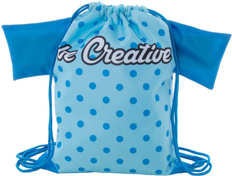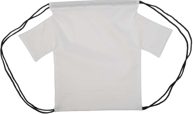 Dětský vak na stažení šňůrkou ve tvaru trička s barevnými šňůrkami, polyester 190T na zakázku. Cena zahrnuje celoplošný sublimační tisk, nezahrnuje tiskovou přípravu. Min. mn.: 50 ks.