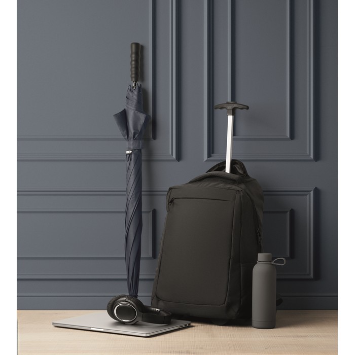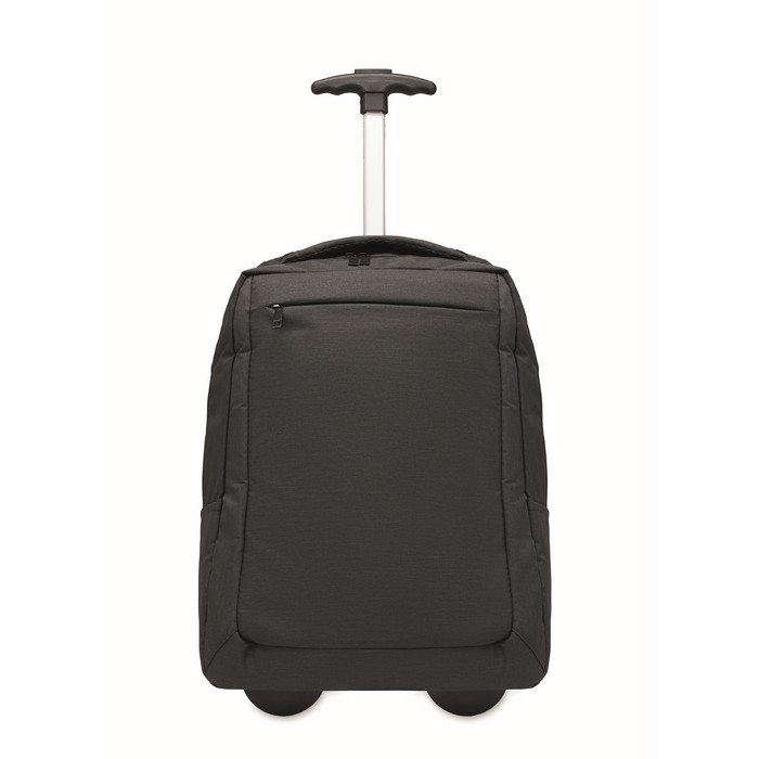 Batoh na kolečkách pro notebook. Vyrobeno z polyesteru 600D RPET. Má jednu vnitřní přihrádku na 15palcový notebook, přední kapsu na zip, dvě boční kapsy na drobnosti a tři vnitřní zasouvací kapsy. Polstrovaná záda a ramenní popruhy. Dvě kolečka a dvojitý trubkový rám.