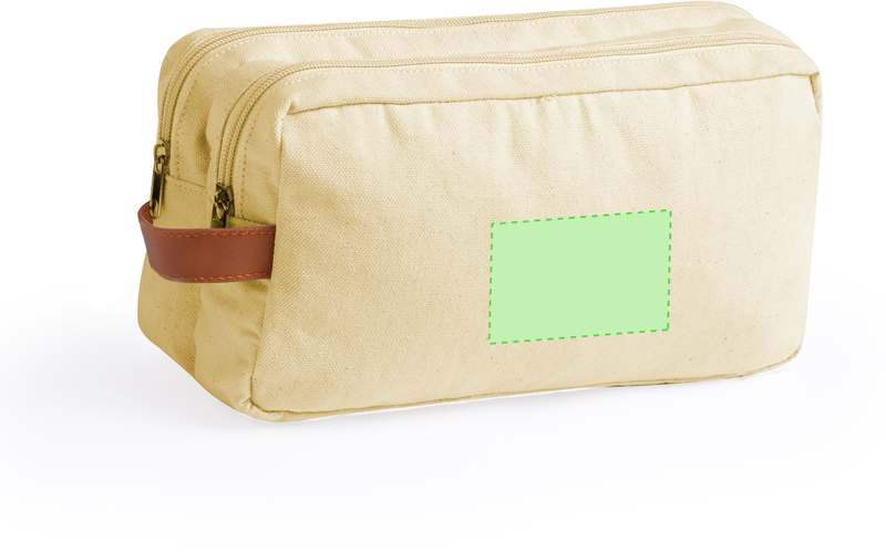 Dvoukomorová kosmetická taška vyrobená z odolného plátna. Se zapínáním na zip, držadly a tahákem z hnědé PU kůže. Dostupné ve stylových barvách.