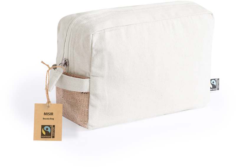 Fairtrade kosmetická taška v přírodní řadě, vyrobená ze 100% bavlny. Hlavní komora se zapínáním na zip a odpovídající rukojetí, s boky a základnou vyztuženou jutou. V elegantním přírodním tónu. Obsahuje Fairtrade štítek a visačku z recyklovaného kartonu s logem Fairtrade. S certifikací Fairtrade, alternativa ke konvenčnímu obchodnímu systému, který sleduje rozvoj národů a boj proti chudobě.